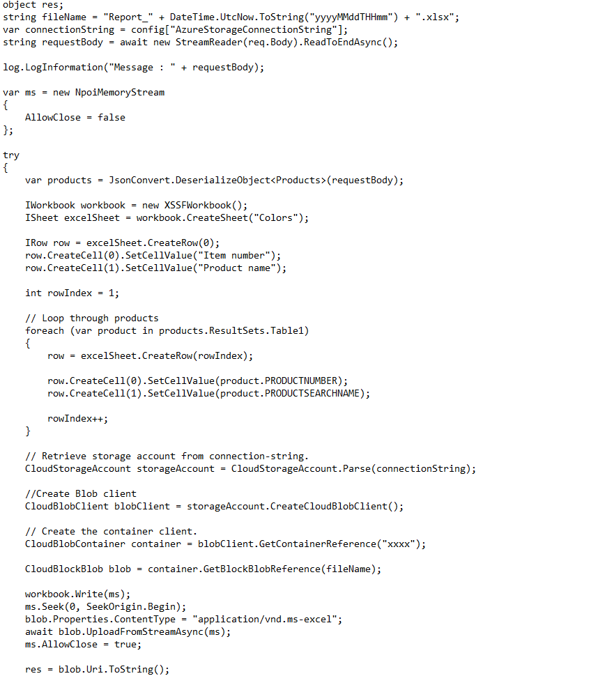 The code snippet (as an example) in the Azure Function responsible for creating the Excel file: